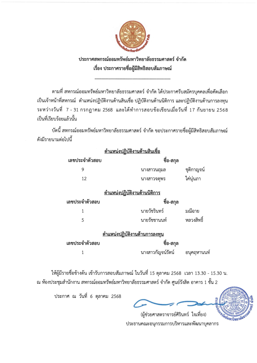 ให้ผู้มีรายชื่อเข้ารับการสอบสัมภาษณ์