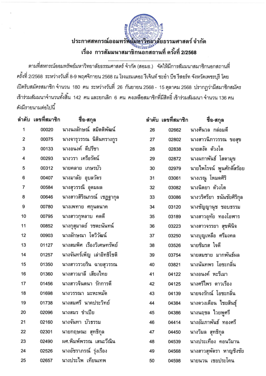 ประกาศรายชื่อ การสัมมนาสมาชิกนอกสถานที่ ครั้งที่ 2/2568