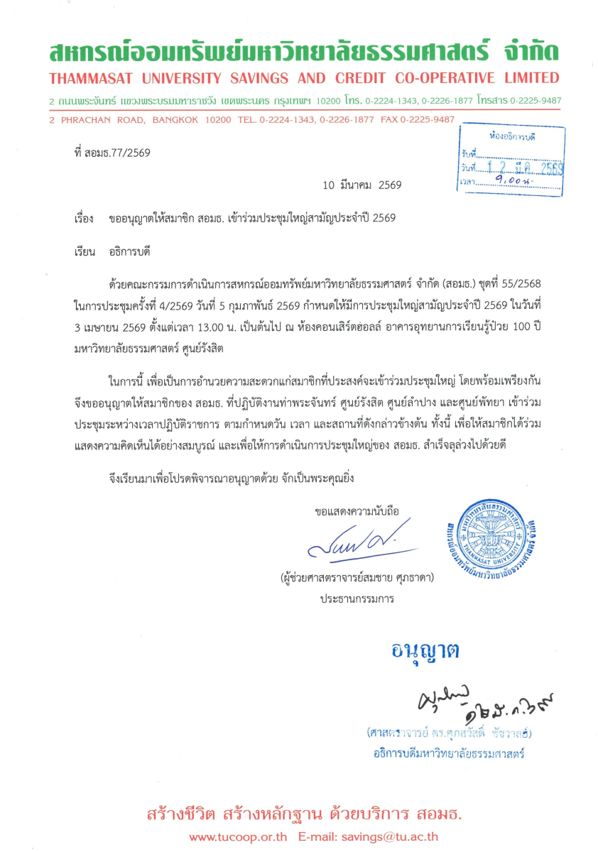 เรียน สมาชิกสหกรณ์ออมทรัพย์มหาวิทยาลัยธรรมศาสตร์ จำกัด