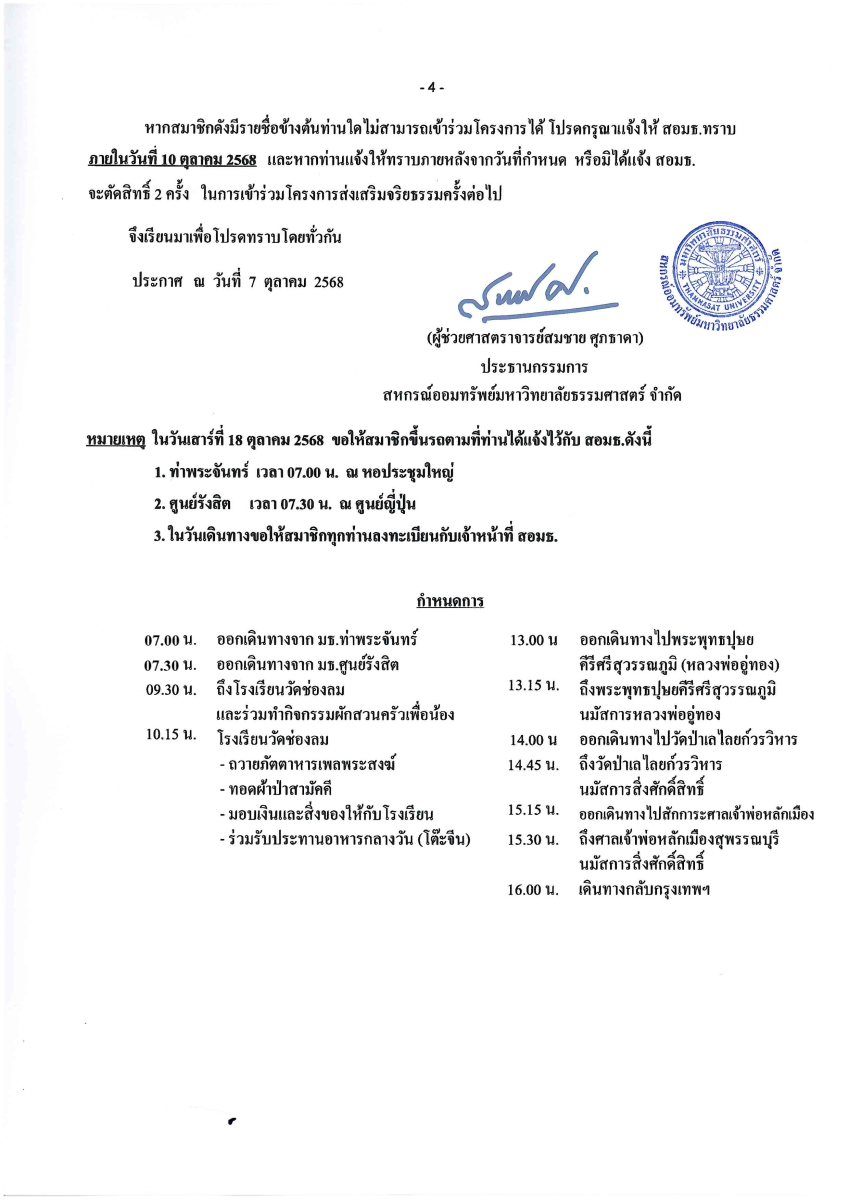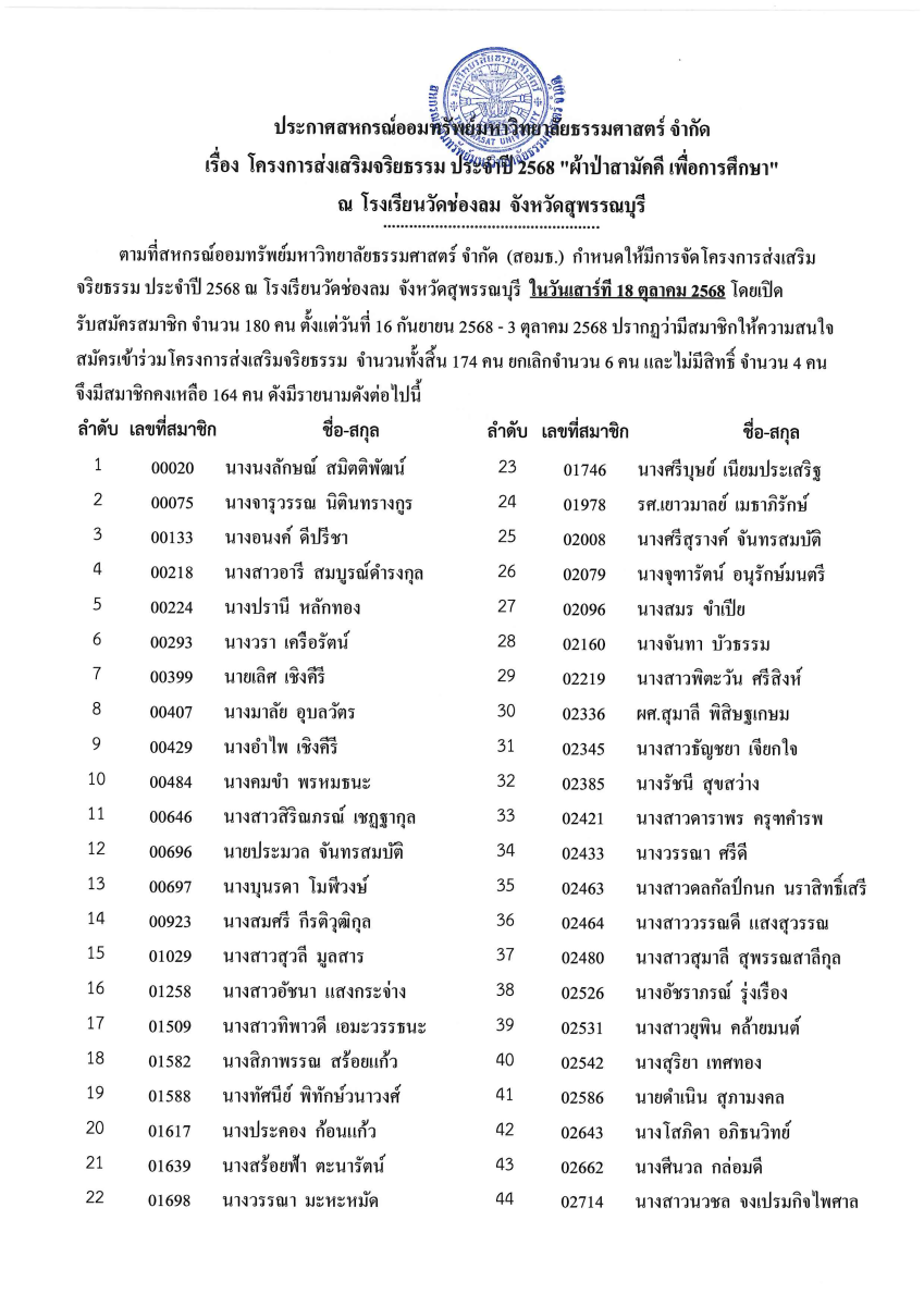 ประกาศ รายชื่อสมาชิกเข้าร่วมโครงการส่งเสริมจริยธรรม ประจำปี 2568