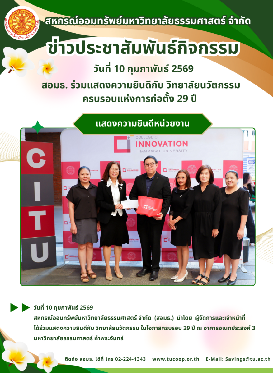 วันที่ 10 กุมภาพันธ์ 2569 สหกรณ์ออมทรัพย์มหาวิทยาลัยธรรมศาสตร์ จำกัด (สอมธ.) นำโดย ผู้จัดการ เจ้าหน้าที่ได้ร่วมแสดงความยินดีกับ วิทยาลัยนวัตกรรมในโอกาสครบรอบ 29 ปี