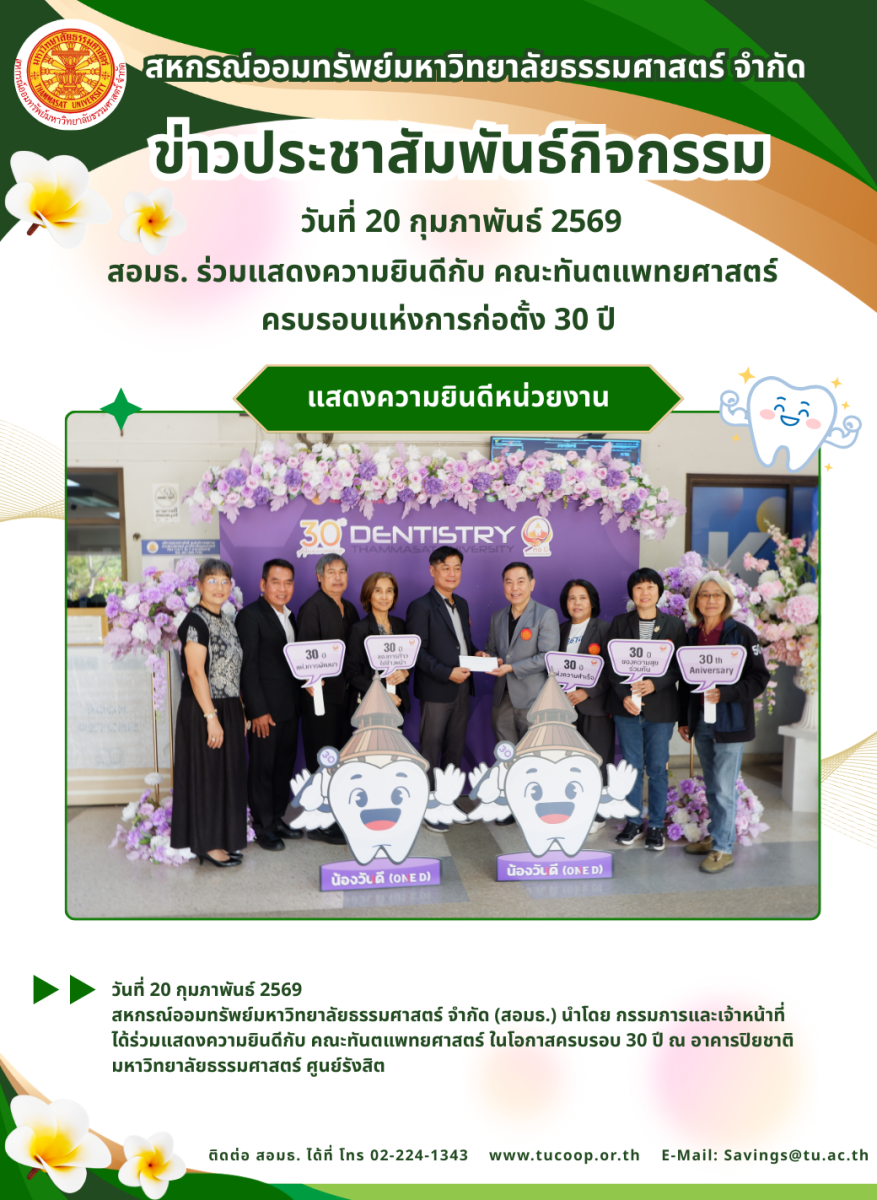 วันที่ 20 กุมภาพันธ์ 2569 สหกรณ์ออมทรัพย์มหาวิทยาลัยธรรมศาสตร์ จำกัด (สอมธ.)ได้ร่วมแสดงความยินดีกับ คณะทันตแพทยศาสตร์ ในโอกาสครบรอบ 30 ปี